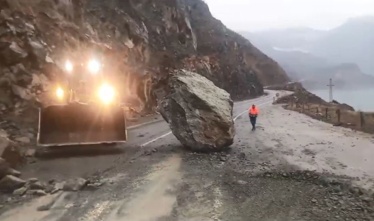 Öte yandan heyelan anında yamaçtan kopan dev kaya kütlesinin karayoluna düştüğü anda bölgeden araç geçmemiş olması muhtemel felaketi önledi.