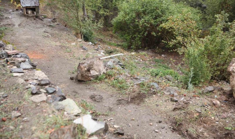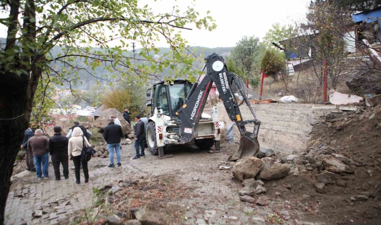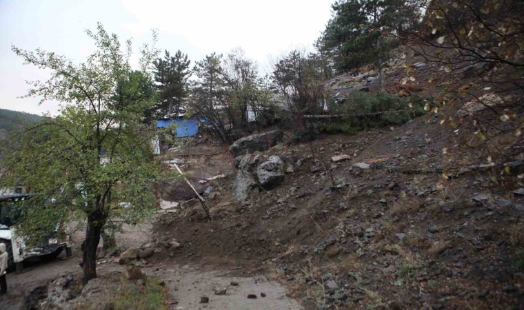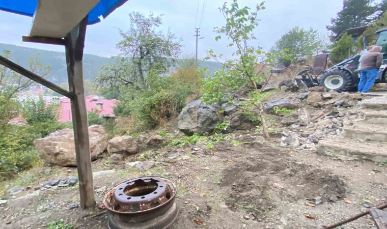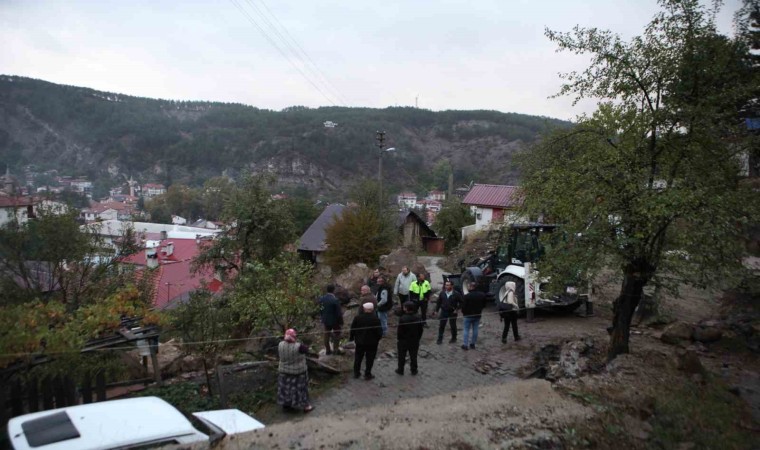 Bolu’da yoğun yağış sebebiyle dağdan kopan kaya, mahallenin ortasındaki yola düştü. Kayanın yoldan kaldırılması için çalışma başlatıldı.