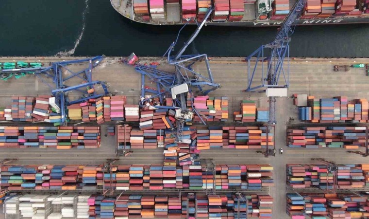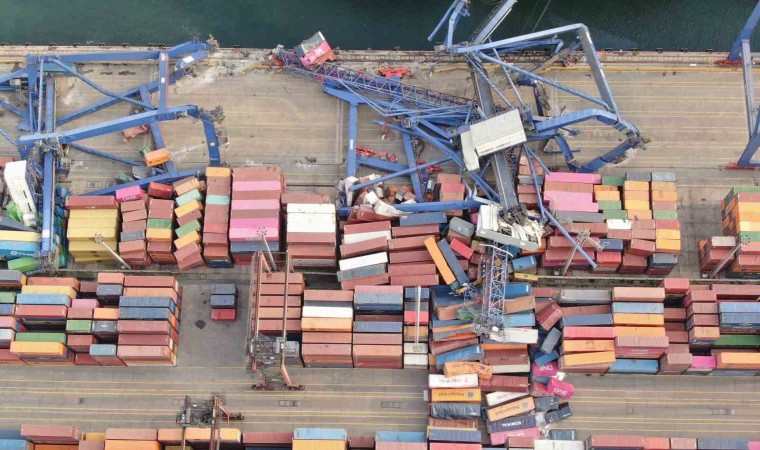 Kocaeli’de Evyapport limanında geminin kıyıda bulunan kule vinçlere çarparak devirmesi neticesinde meydana gelen hasar dron ile havadan görüntülendi.