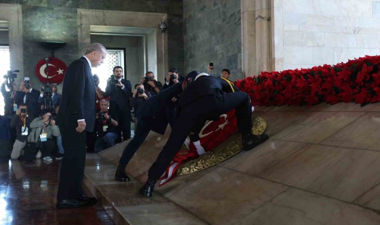 Cumhuriyet’in kuruluşunun 100. yıl dönümü dolayısıyla Anıtkabir’i ziyaret eden devlet erkanı, Aslanlı Yol’dan geçerek Gazi Mustafa Kemal Atatürk’ün mozolesine ay yıldızlı çelenk koydu. Ardından saygı duruşunda bulunan devlet erkanı, İstiklal Marşı’nı okudu. Erdoğan ve beraberindekiler, daha sonra Misak-ı Milli Kulesi’ne geçti. Cumhurbaşkanı Erdoğan, Anıtkabir Özel Defteri’ne şunları yazdı: