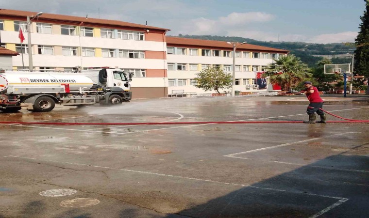 Zonguldak’ın Devrek İlçesi Belediyesi İtfaiye ekipleri eğitim öğretim sürecinin başlamasına az bir zaman kala ilçedeki okulların bahçelerinde yıkama ve temizlik çalışmalarına başladı.