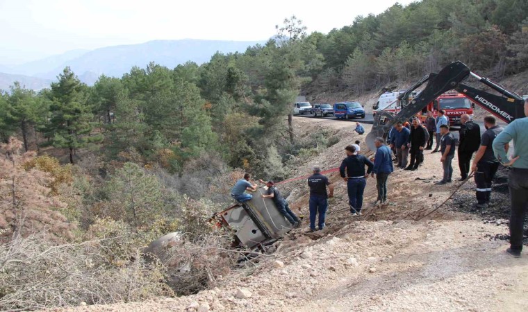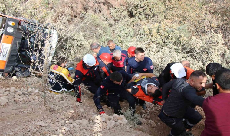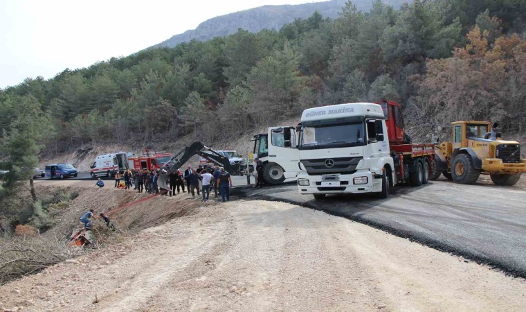 Amasya’da asfaltlama çalışmasında kullanılan bir silindir yoldan çıkarak ağaçların arasına devrildi. Aşağı sürüklenmemesi için halatlarla iş makinelerine bağlanan 11 ton ağırlığındaki silindirde sıkışan operatörü kurtaran ekipler, can pazarında zamanla yarıştı.