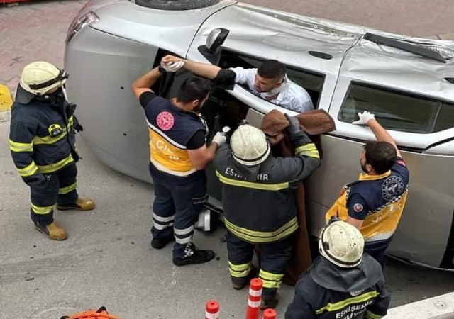 Eskişehir'de meydana gelen trafik kazası, sokak üzerindeki bir kavşakta iki otomobilin çarpışması sonucu meydana geldi. Bu ani çarpışmanın etkisiyle bir otomobil yan yatarak durabildi. Devrilen aracın içinde bulunan 2 kişi, kaza sonrası araç içinde sıkıştılar ve yardıma ihtiyaç duydular.