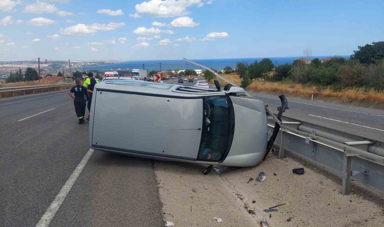 Tekirdağ’ın Süleymanpaşa ilçesinde devrilen hafif ticari araçtaki 2 kişi kazayı burnu bile kanamadan atlattı.