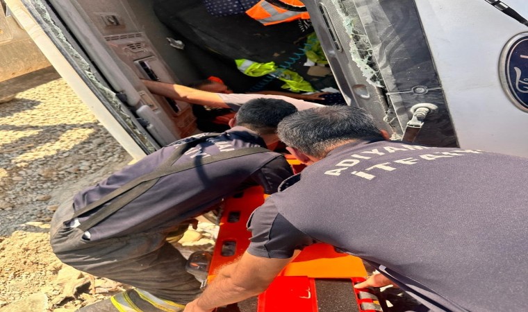 Adıyaman’da devrilen kamyon içerisinde sıkışan sürücü, itfaiye ekiplerinin çalışmaları sonucu kurtarıldı.