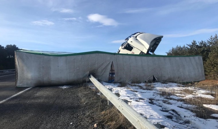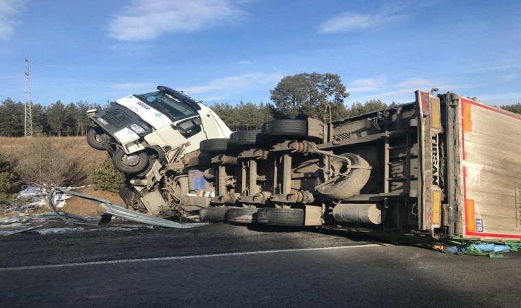 Ardahan’da dorsesinde kimyasal toz yüklü tırın buzlu yolda devrilmesiyle Kars yolu bir süre ulaşıma kapandı.