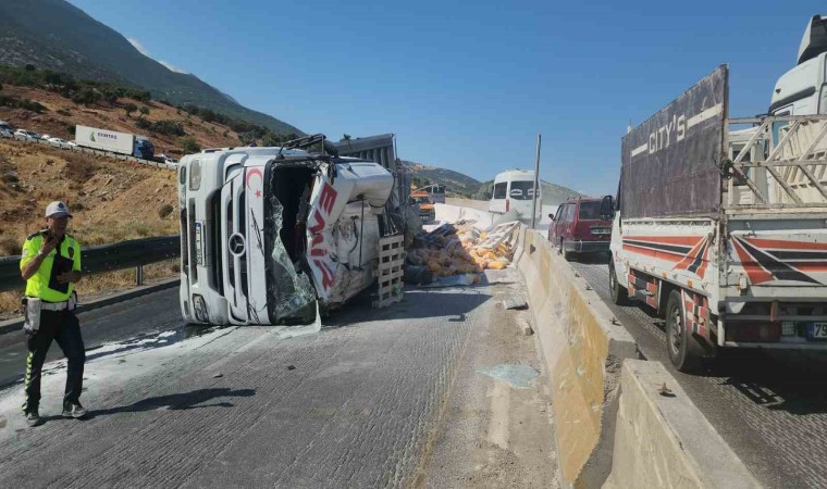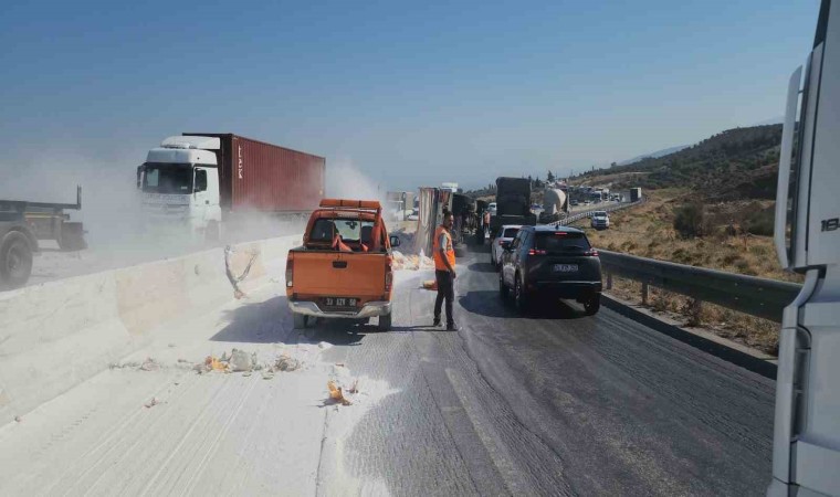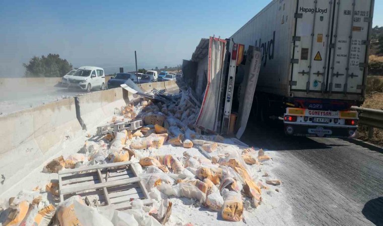 Hatay’ın Belen ilçesinde çimento torbası yüklü tırın devrilmesi sonucu meydana gelen kazada sürücü yaralandı.