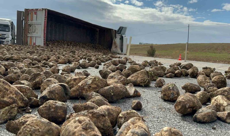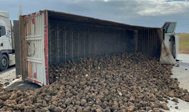Afyonkarahisar’da kontrolden çıkarak devrilen şeker pancarı yüklü tırın dorsesindeki 27 yon pancar etrafa dağıldı. Yola dağılan pancarları ise şans eseri kazayı yara almadan atlatan şoför ve yardımcısı temizledi.