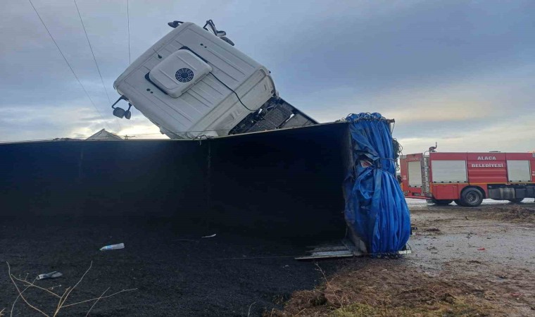 Kaza, Alaca ilçesi Camili köyü mevkiinde meydana geldi. Edinilen bilgiye göre, sürücüsünün direksiyon hakimiyetini kaybettiği kömür tozu yüklü 09 ABP 613 plakalı Mercedes marka tır, yoldan çıkarak tarlaya devrildi. Devrilen tırın kabin kısmı havada asılı kalırken, sürücü kazadan yara almadan kurtuldu. Tırın olay yerinden kaldırılması için çalışma başlatıldı.