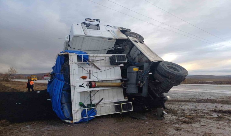Çorum’da devrilen tırın kabin kısmı havada asılı kaldı.
