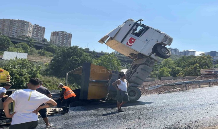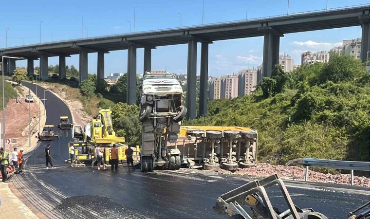KOCAELİ (İHA) – Kocaeli’nin İzmit ilçesinde asfalt çalışmaları sebebiyle ulaşıma kapalı olan yolda mıcır taşıyan tır devrildi. Kazada tırın kupası şaha kalktı.