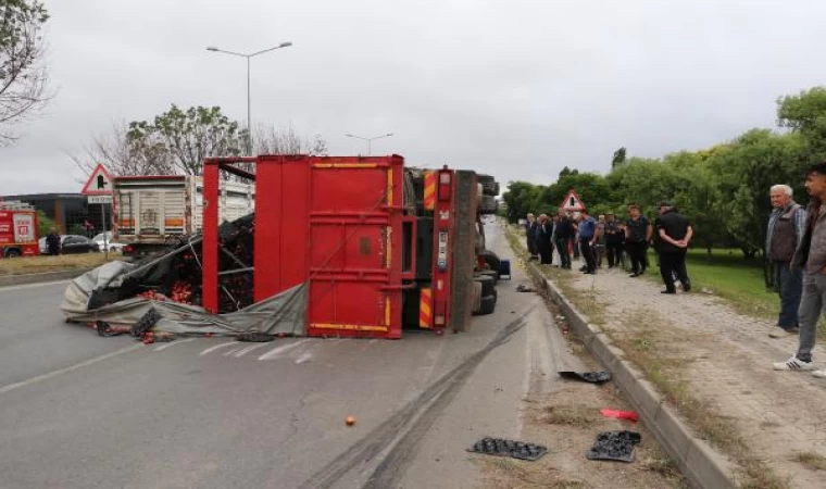 Devrilen TIR’ın sürücüsü yaralandı, meyve yükü yola saçıldı
