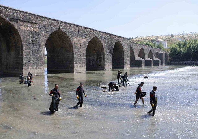 Açıklamaların ardından dalış elbisesi giyen AFAD ekipleri, tarihi köprü içerisinden geçen Dicle Nehri’ne girerek temizlik yaptı.