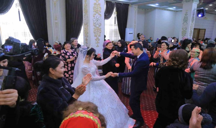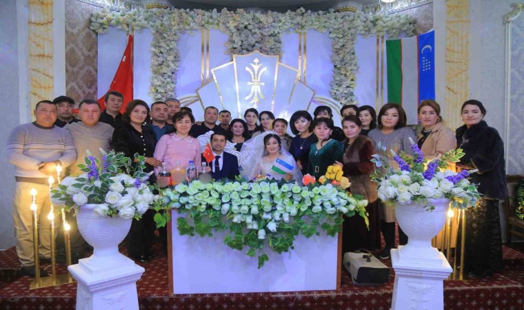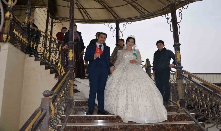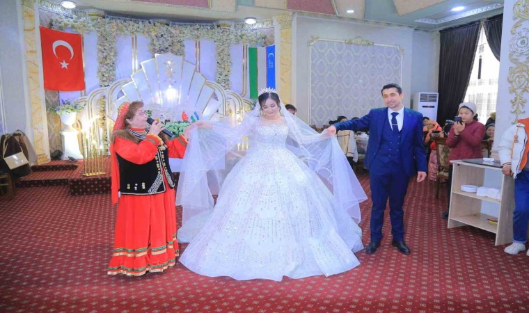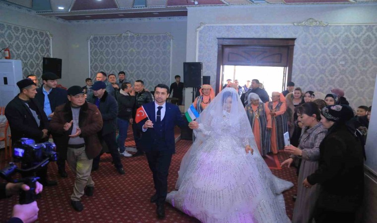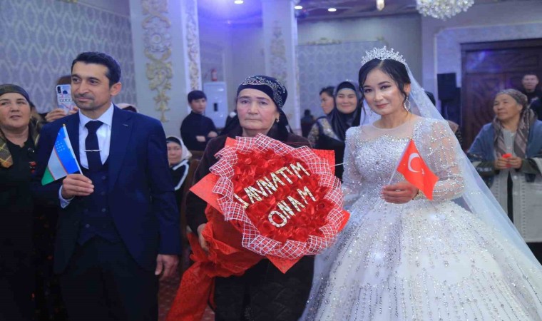 Türkiye ve Özbekistan bayrakları eşliğinde düğün salonuna giriş yaptılar