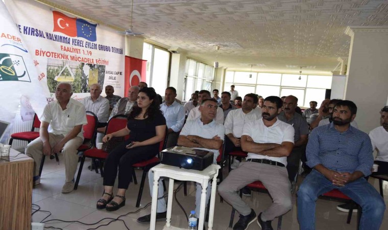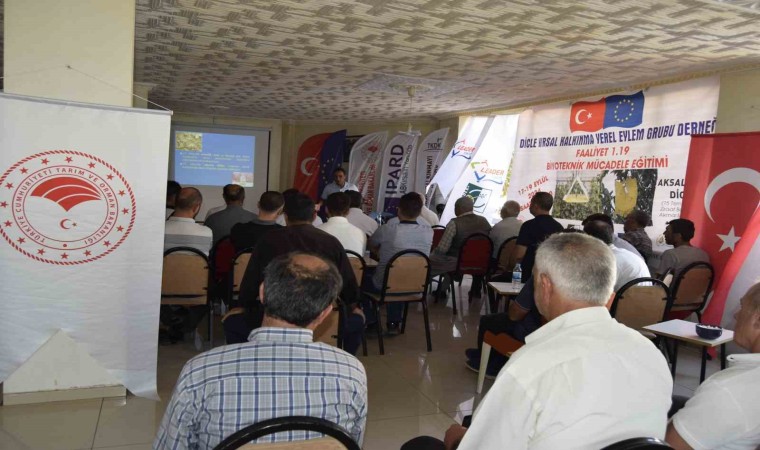 DİKKAD tarafından düzenlenen 3 günlük programda, Dicle Üniversitesi Ziraat Fakültesi Öğretim Üyesi Prof. Dr. Erol Bayhan çiftçilere biyoteknikle mücadele eğitimi vermeye başladı. Programın ilk gününde çiftçilerin sorunlarını dinleyen ve sorularını cevaplayan Prof. Dr. Erol Bayhan, tarımsal faaliyetlerde yerli ve milli ürünlerin tercih edilmesine dikkat çekerek, ata tohumunun korunması gerektiğini vurguladı. Yazın aşırı sıcağında çiftçilerin ürünlerini güneş yanıklarına karşı kaolin kili kullanabilecekleri belirten Prof. Dr. Erol Bayhan, tarımda doğru ilaçlama ve zararlı böceklerle mücadele yöntemlerini, karşılaşabilecek sorunların çözüm yollarını anlattı.