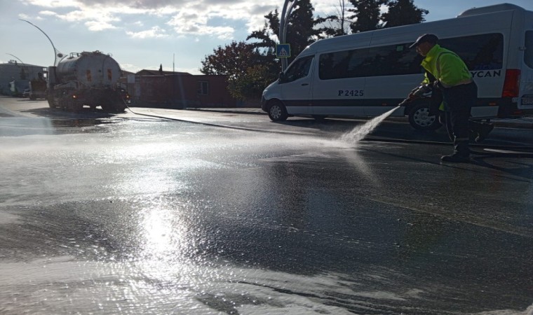 Dilovası’nda ana arterlerde deterjanlı ve tazyikli su kullanarak temizlik yapılıyor.