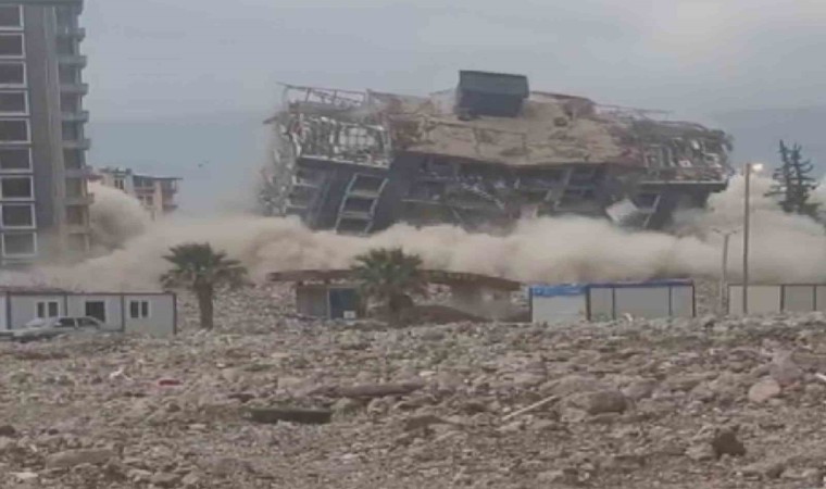 Depremin vurduğu Hatay’da dinamitle patlatılan 10 katlı bina kağıt gibi yerle bir oldu.