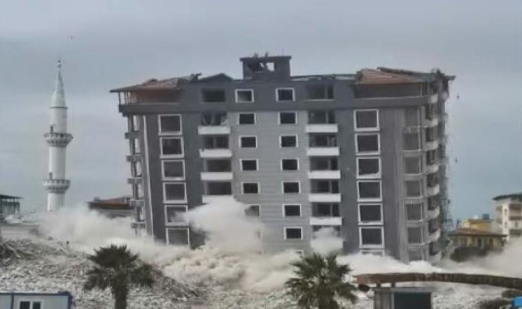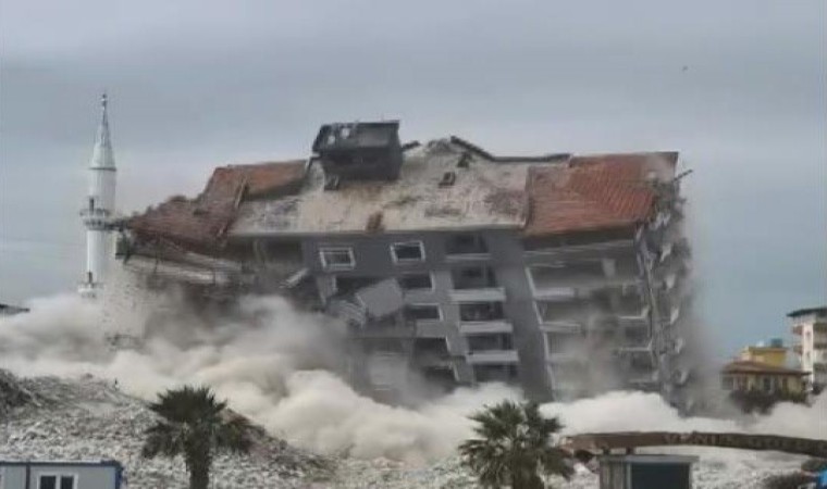 Depremin vurduğu Hatay’da dinamitle patlatılan 10 katlı bina kağıt gibi yerle bir oldu.