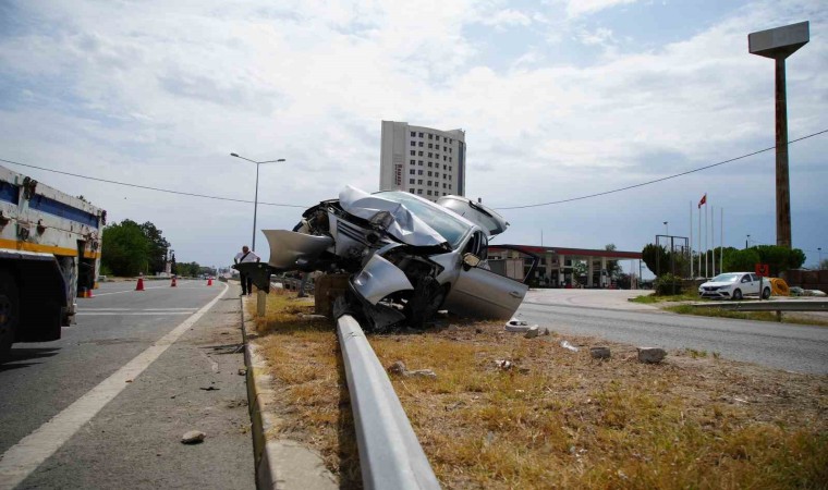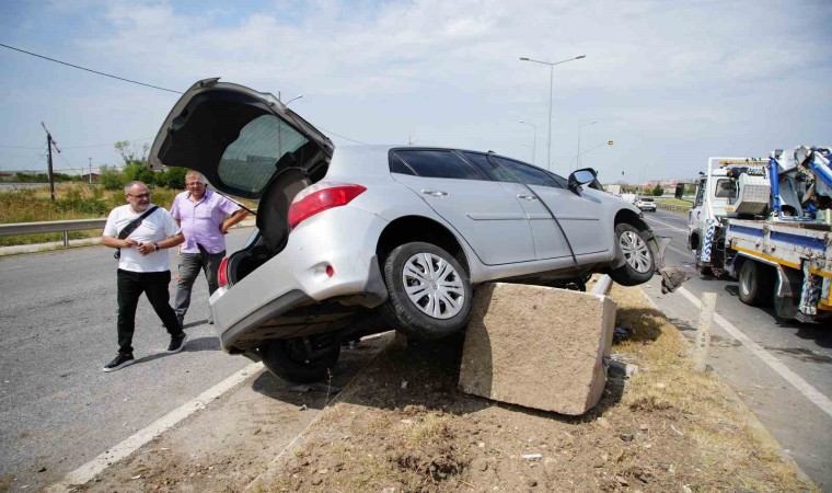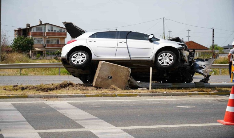 Yaşanan kazada otomobil askıda kalırken, aydınlatma direği ise yerinden sökülerek devrildi. Otomobilde bulunan sürücüsü Mehmet E. ve iki çocuğu yaralandı.