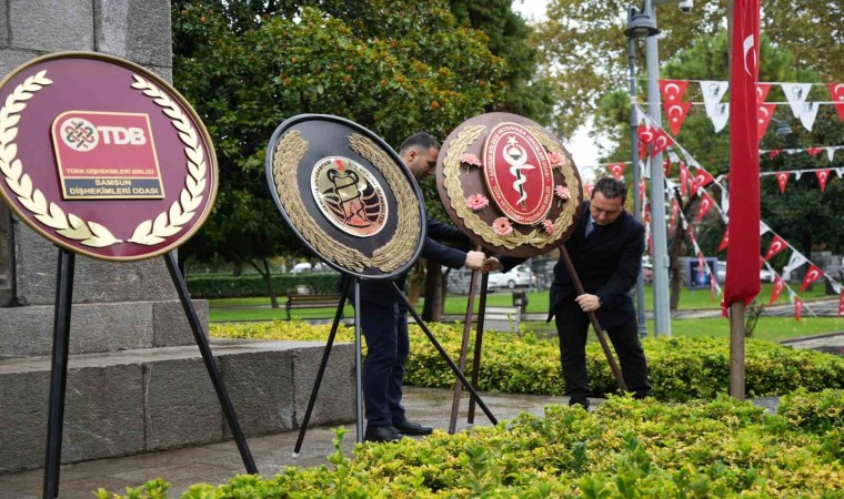 “22 Kasım Diş Hekimleri Günü ve Toplum Ağız Diş Sağlığı Haftası” dolayısıyla Atatürk Anıtı’nda tören düzenlendi. Tören, Veteriner Hekimler Odası, Eczacı Odası, Tabip Odası, OMÜ Dişhekimliği Fakültesi ve Dişhekimleri Odası’nın çelenk sunumu ile başladı. Saygı duruşu ve İstiklal Marşı’ndan sonra konuşan Başkan Övgü Tunçdemir Eyüboğlu, diş hekimlerinin talep ve önerilerini ifade etti.