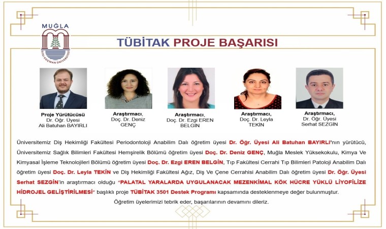 Multidisipliner bir ekip tarafından yürütülecek projede Diş Hekimliği Fakültesi Periodontoloji Anabilim Dalı Öğr. Üyesi Ali Batuhan Bayırlı yürütücü; Sağlık Bilimleri Fakültesi Hemşirelik Bölümü Öğr. Üyesi Doç. Dr. Deniz Genç, Muğla Meslek Yüksekokulu Kimya ve Kimyasal İşletme Teknolojileri Bölümü Öğr. Üyesi Doç. Dr. Ezgi Eren Belgin, Tıp Fakültesi Cerrahi Tıp Bilimleri Patoloji Anabilim Dalı Öğr. Üyesi Doç. Dr. Leyla Tekin ve Diş Hekimliği Fakültesi Ağız, Diş ve Çene Cerrahisi Anabilim Dalı Öğr. Üyesi Dr. Serhat Sezgin ise araştırmacı olarak yer alıyor.