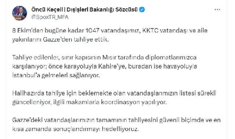 Doğa Başak ÖZTÜRK/ANKARA, (DHA)- DIŞİŞLERİ Bakanlığı Sözcüsü Öncü Keçeli, 8 Ekim'den bugüne kadar 1047 Türk vatandaşı, Kuzey Kıbrıs Türk Cumhuriyeti (KKTC) vatandaşı ve aile yakınının Gazze'den tahliye edildiğini duyurdu.