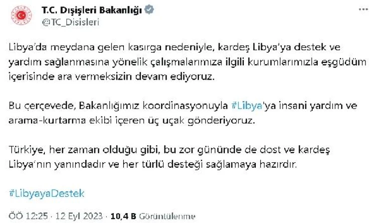 Dışişleri Bakanlığı, dost ve kardeş Libya'ya her türlü yardımı sağlamaya hazır olduğunu vurgulayarak, bu zorlu döneminde Libya'nın yanında olduğunu bir kez daha dile getirdi.