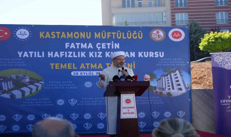 Diyanet İşleri Başkanı Prof. Dr. Ali Erbaş, Kastamonu’da “Fatma Çetin Yatılı Kız Hafızlık Kur’an Kursu”nun temel atma törenine katıldı. Kur’an-ı Kerim tilavetinin ardından konuşan Diyanet İşleri Başkanı Prof. Dr. Ali Erbaş, “Sizin en hayırlınız Kur’an’ı öğrenenleriniz ve öğretenlerinizdir” hadis-i şerifini hatırlatarak, “Temelini atacağımız Kur’an kursunda hem öğrenenler olacak, hem öğretenler olacak. Dolayısıyla en hayırlı insanların bulunacağı bir binanın temelini atıyoruz. Rabbimizin insanları karanlıklardan aydınlığa çıkarmak için gönderdiği Kur’an-ı Kerim’in hem öğrenildiği hem anlaşılmaya çalışıldığı hem de Kur’an-ı Kerim’in en doğru bir şekilde öğretildiği bir eğitim yuvası, bir ilim irfan merkezinin temelini atıyoruz” dedi.