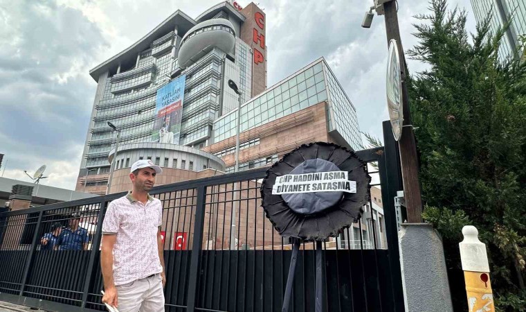 Basın açıklamasının ardından ‘CHP haddini aşma diyanete sataşma’ yazılı çelengi genel merkez önüne bıraktı.