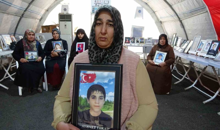 Oğlunun 8’inci sınıf öğrencisiyken kaçırıldığını söyleyen Tokay, “Benim oğlum 14 yaşında 8’inci sınıf öğrencisiydi. 2011 yılında HDP tarafında kandırılarak dağa kaçırıldı. 5 yıldır bu çadırın altında evlat mücadelemize devam ediyoruz. HDP’de vicdan olsaydı, burada 5 yıldır gözyaşı döküyoruz ama maalesef onlar bizi görmezden geliyor. Oğlum eğer beni görüp duyuyorsan o zalimlerin elinden kaç gel” dedi.