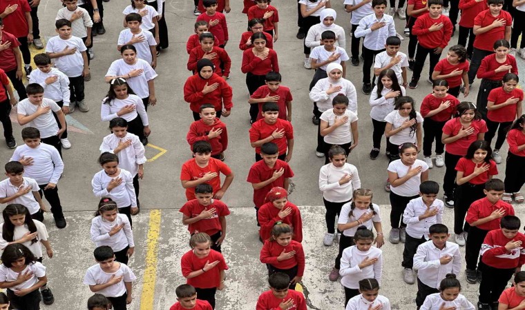Kırmızı-beyaz giydikleri elbiselerle koreografiye katılan öğrenciler, “Feda Türkiye’m” çalışmasını hep bir ağızdan seslendirdi. Öğrencilerin koreografisi okulun en son katından görüntülendi.