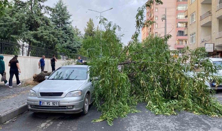 Diyarbakır’ın merkez Yenişehir ilçesinde dev ağaç, rüzgar nedeniyle park halindeki otomobilin üstüne devrildi.