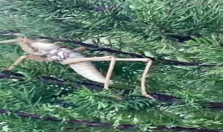 Diyarbakır’ın Silvan ilçesinde çam ağacında bulunan dev etçil çekirge, cep telefonuyla görüntülendi.