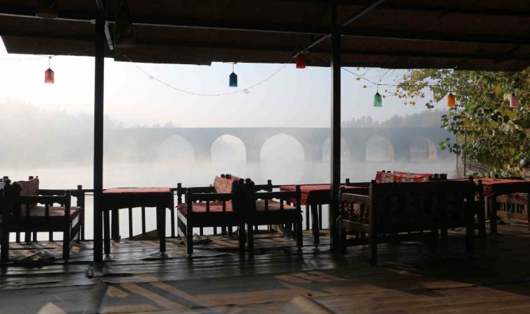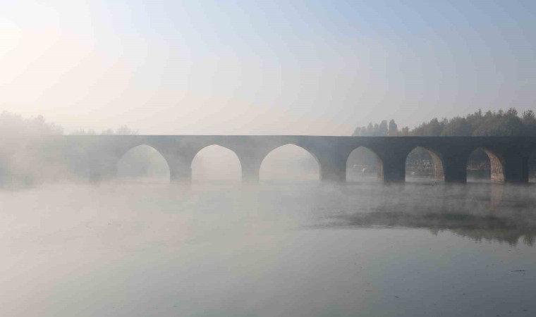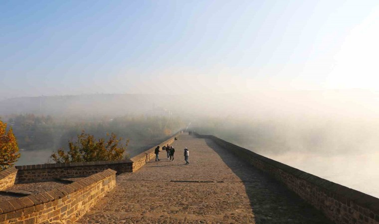 Diyarbakır’da hava sıcaklarının 3 dereceye kadar düşmesiyle sabah saatlerinde etkili olan sis, UNESCO Dünya Kültür Mirası listesindeki tarihi surlar, Hevsel Bahçeleri, miras alanının parçası olan On Gözlü Köprü gibi mekanlarda kartpostallık görüntü oluşturdu.