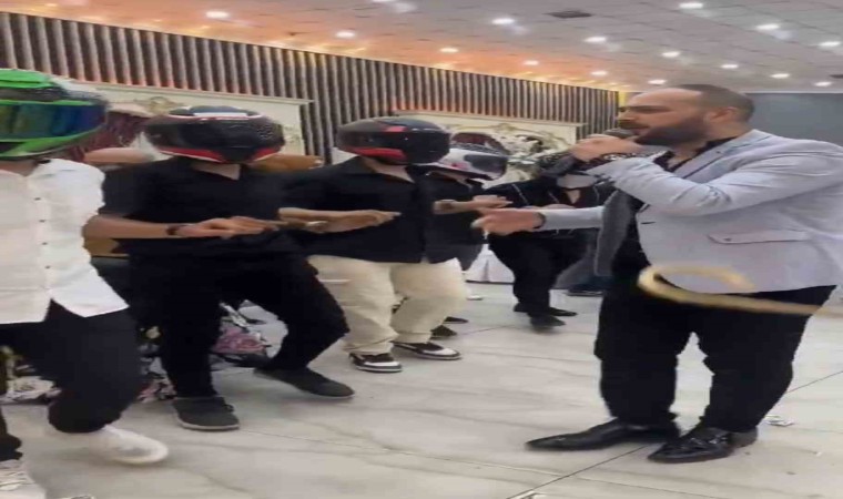 Diyarbakır’da motosiklet sevdalısı damadın arkadaşları, düğün salonunda kasklarını takıp halay çekti. Damat, düğünde kaskını takıp doyasıya eğlendi.