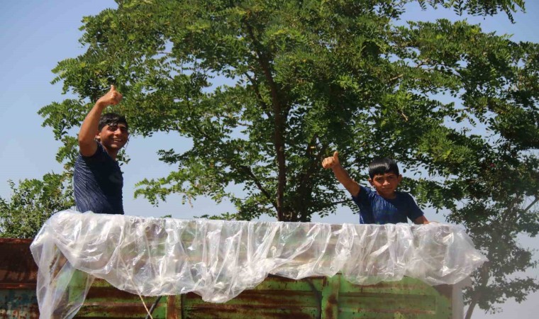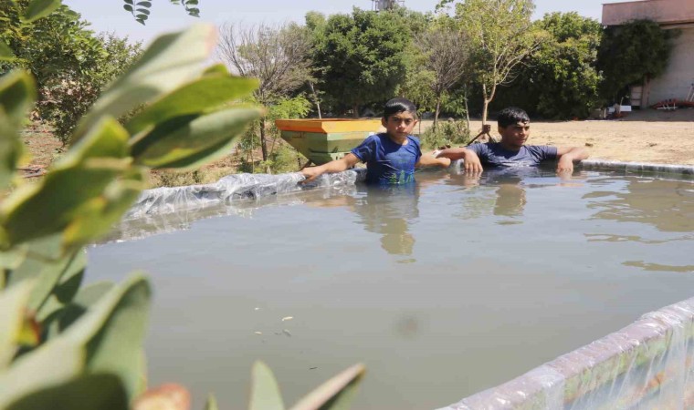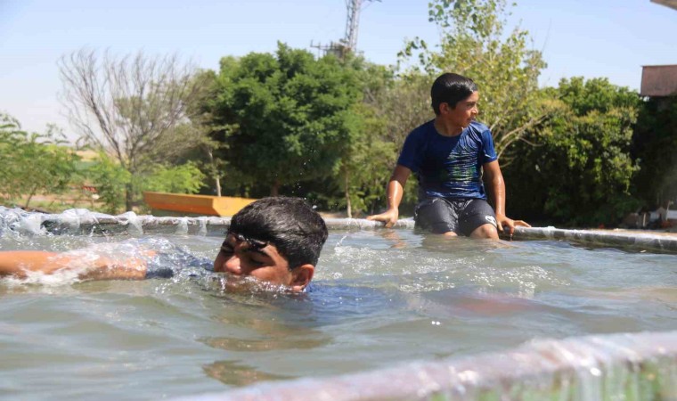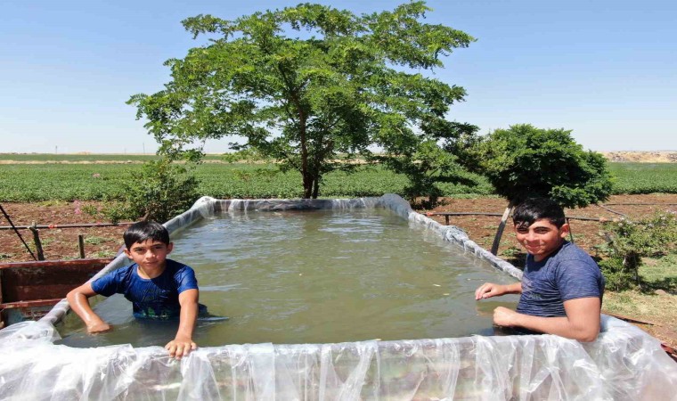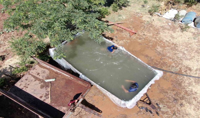 Ailesiyle birlikte 11 senedir aynı yerde çiftçilik yaptığını belirten Kaçmaz, bu sene sıcakların bayağı arttığını söyledi. Termometrenin 40 dereceyi gösterdiğini ama daha da üstü olduğunu ifade den Kaçmaz, çocuklarının suya alıştığını kaydetti. Çocuklarının her sene bu vakitlerde ‘Baba bize havuz yap, yüzeceğiz’ dediğini dile getiren Kaçmaz, “Biz de römork içine branda serip su dolduruyoruz. Hava sıcak, onlar giriyor. Ama fazla da bırakmıyoruz. Canları yanıyor. Termometre 40 gösteriyor, bence 50 derece de vardır. Keşke hepimiz çocuklar gibi böyle eğlenebilsek. Kendimizce pratik bir çözüm bulduk” dedi.