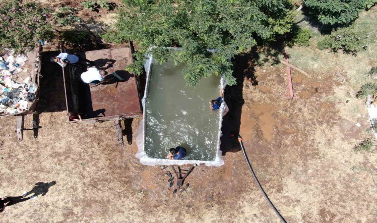 Diyarbakır’ın Çınar ilçesinde 11 çocuk babası çiftçi Askeri Kaçmaz, sıcaktan bunalan çocukları için römorka branda geçirip havuza çevirdi.