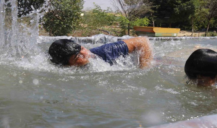 Kahraman Kaçmaz ise, havanın çok sıcak olduğunu aktararak, “Etrafımızda havuz ve su bulunmadığı için babam bize böyle bir yöntem buldu. Sıcak, bizde böyle serinliyoruz” diye konuştu.
