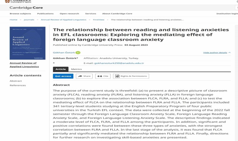Anadolu Üniversitesi Eğitim Fakültesi İngiliz Dili Eğitimi Anabilim Dalı Öğretim Üyesi Doç. Dr. Gökhan Öztürk’ün “The relationship between reading and listening anxieties in EFL classrooms: Exploring the mediating effect of foreign language classroom anxiety” başlıklı makalesi Cambridge Üniversitesi yayınevi tarafından yayınlanan ve aynı zamanda Amerika Uygulamalı Dilbilim Derneği’nin (AAAL) resmî bilimsel dergisi olan Annual Review of Applied Linguistics’de yayınlandı.