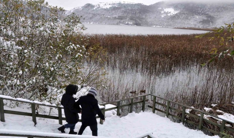 Şehir merkezine 35 kilometre uzaklıktaki Türkiye’nin önemli turizm merkezlerinden Abant Gölü Milli Parkı’nda kasım ayında kış güzelliği yaşanıyor. Geçtiğimiz gün bölgede etkili olan kar yağışı dolayıyla yeşil alanlarda kar kalınlığı 30 santimetreye ulaştı. Beyaz örtüyle kaplanan Abant Gölü Milli Parkı’nda kartpostallık görüntüler ortaya çıktı. Mevsimin ilk kar yağışıyla birlikte beyaza bürünen Abant’a ziyaretçiler akın etti. Göl etrafında araçlarıyla turlayan vatandaşlar bol bol fotoğraf çektirdi.
