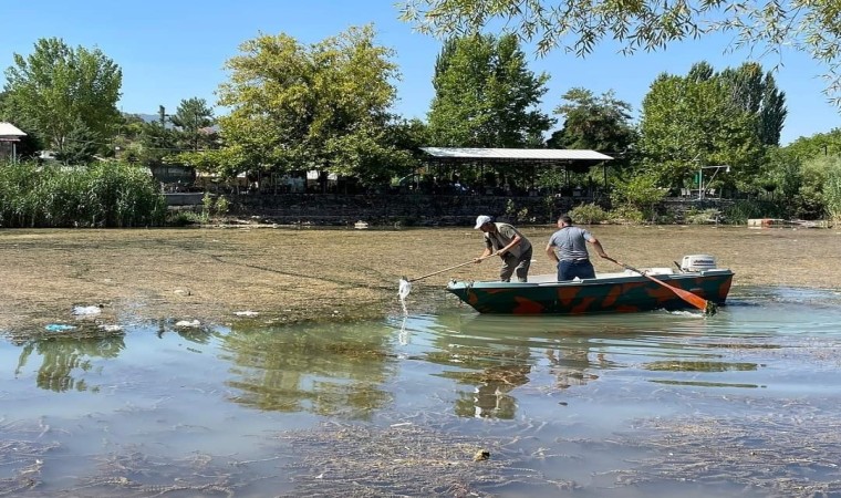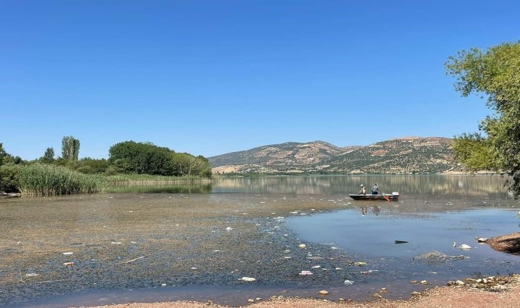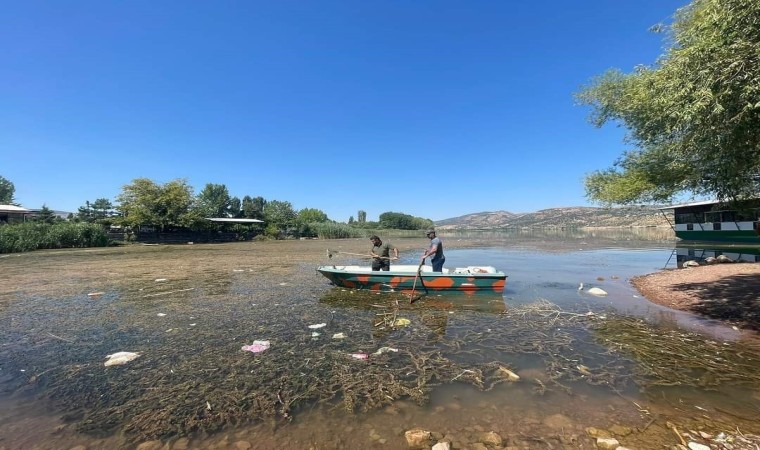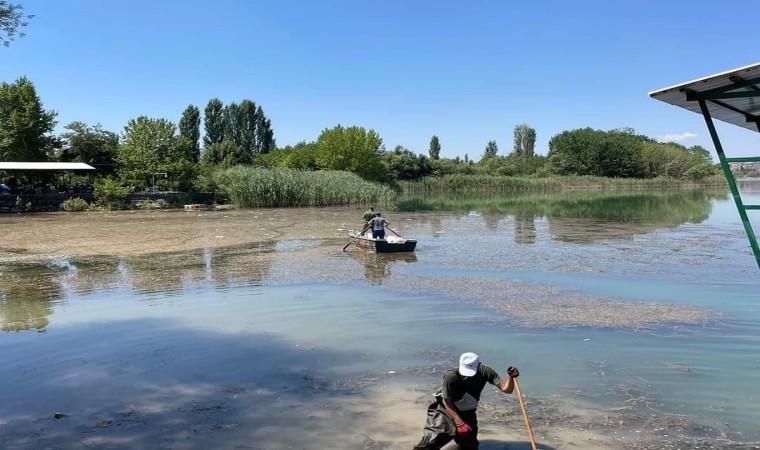 Adıyaman’ın Gölbaşı ilçesinde doğa koruma ekipleri tarafından göl yüzeyinde biriken çöpler temizleniyor.