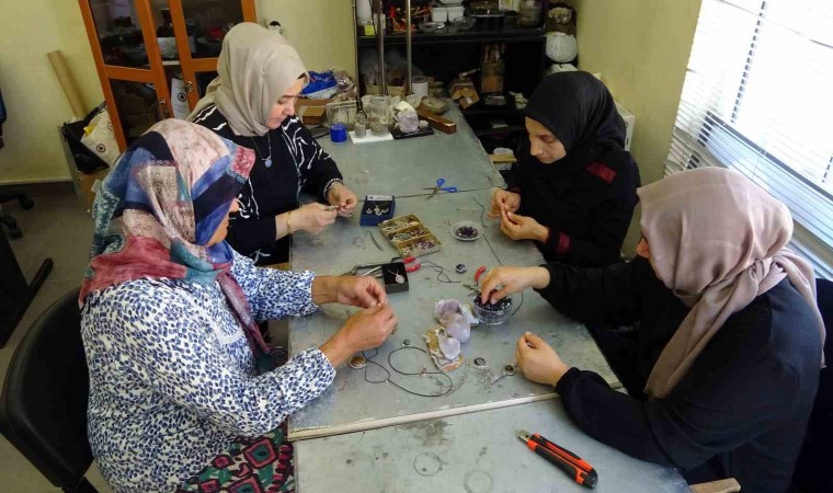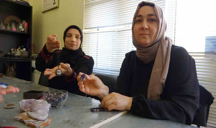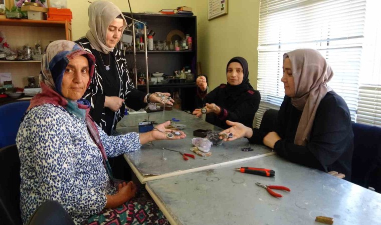 Fadime Çevik isimli kursiyer de “Burada taşları işleyip yüzük, kolye, bileklik yapıyoruz, Taşları işlerken huzur buluyoruz, stres atıyoruz çalışırken, rahatlıyoruz. Bizim için çok iyi oluyor. Bu ürünleri satarak aile bütçemize katkı sunuyoruz” şeklinde konuştu.