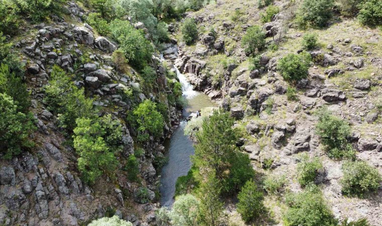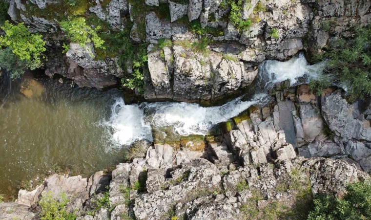 Kartpostallık güzelliği ile dikkat çeken şelale dron ile havadan görüntülendi.