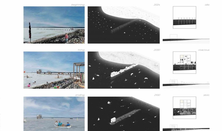 Proje hakkında konuşan Sertaç Erbilgin, “Yarışmada kıyıda bir tasarım isteniyordu. Bizim amaçladığımız şey Çanakkale’de kullanılmayan bir plajın gelecekteki kurgusuna atıfta bulunarak, o kıyının gelecekteki 100 yıl içinde nasıl bir dönüşüm göstereceğini açıklamak istedik. 2100 yılında suların yükselmesiyle kıyı sular altında kalıyor ve malzeme doğaya tekrar kavuşuyor. Malzemenin doğadan alınıp daha sonra doğaya tekrar bırakılması fikri dikkat çekti. Aslında hiçbir malzeme atıl durumda değildi, sadece sırasını bekliyordu” dedi.