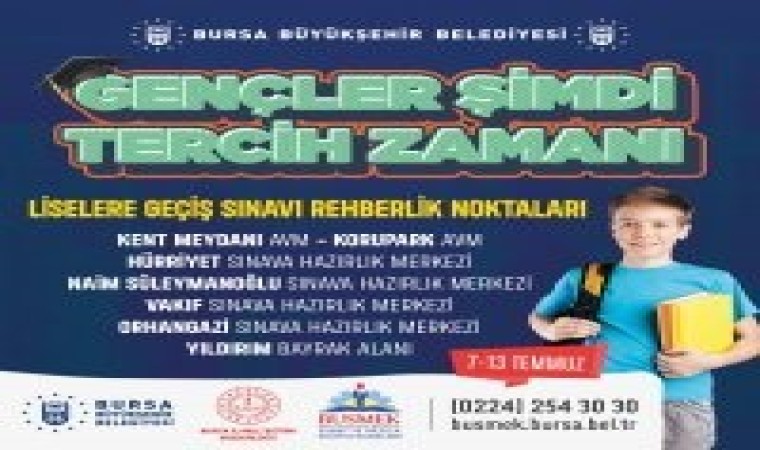 BURSA BÜYÜKŞEHİR BELEDİYESİ, LİSELERE GEÇİŞ SİSTEMİ’NDE (LGS) TERCİH DÖNEMİ BAŞLAMASIYLA BİRLİKTE ÖĞRENCİLERİN YANINDA OLMAYA DEVAM EDİYOR. KENTİN 7 FARKLI NOKTASINDA KURULACAK ‘LİSE TERCİH REHBERLİK NOKTALARI’ İLE ÖĞRENCİLERE DOĞRU TERCİHLER YAPMALARI İÇİN DANIŞMANLIK DESTEĞİ VERİLECEK.