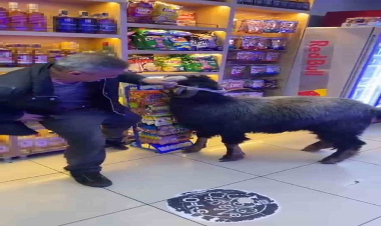 Artvin’in Şavşat ilçesinde alışveriş yapmak için market önüne arabasıyla gelen bir aile, markete girince araçtaki yavru keçi de arabadan atlayıp peşlerinden girdi. Market içinde dolaşan, rafları gezen keçi sahibi para öderken bile yanından ayrılmadı.