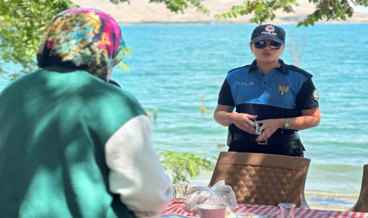 Elazığ Emniyet Müdürlüğüne bağlı Toplum Destekli Polislik Şube Müdürlüğü görevlileri, Hazar Gölü sahilinde ’Tedbirlere uyalım, hayatta kalalım’ yazılı bilgilendirme broşürlerini dağıtarak vatandaşları boğulmalara karşı uyardı.
