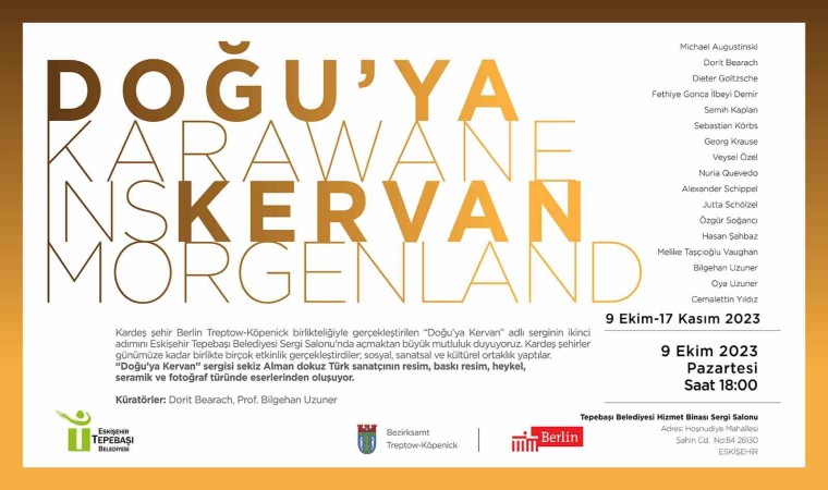 Tepebaşı Belediyesi’nin kardeş şehirleriyle, proje paylaşımları, fikir alışverişleri devam ederken, kültür ve sanat alanında da çalışmalar yapılmaya devam ediyor. 2017 yılından itibaren Tepebaşı Belediyesi’nin kardeş şehri olan Berlin Treptow-Köpecik Belediyesi ile sosyal, sanatsal ve kültürel anlamda yapılan çalışmalara bir yenisi daha ekleniyor. 8’i Alman, 9’u Türk olmak üzere 17 sanatçının hazırlamış olduğu ‘Doğu’ya Kervan’ isimli karma serginin ikinci adımı Eskişehir’de gerçekleşecek. Resim, baskı resim, heykel, seramik ve fotoğrafların yer alacağı serginin açılışı 9 Ekim Pazartesi günü saat 18.00’de Tepebaşı Belediyesi hizmet binası içerisinde yer alan Sergi Salonu’nda gerçekleşecek.
