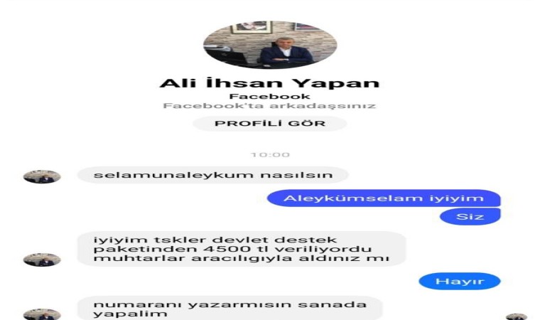 Dolandırıcılık olayının olduğunu mahalle sakinlerinin bilgi vermesi üzerine öğrendiğini kaydeden Muhtar Yapan, “Sabah saatlerinde dostlarım bana mesaj atmaya başladı, ’Facebook hesabın kopyalanmış, onunla bir ilgilenir misin’ diye. Girip baktığımda kopyalandığını gördüm. Vatandaş, 4 bin 500 lira gibi bir parayı dağıttığımızdan bahsetmiş. Tabii ki bizim tarafımızdan böyle bir durum yok. Hemen engelledik, hesabı şikayet ettik. Tekrar sosyal medyada paylaşım yaptık. Ondan sonra sosyal medyadan yazan ya da arayan çok fazla kişi oldu. Bu arkadaşlarımızı uyardık, engellemelerinden ve şikayet etmelerinden bahsettim. Mahallemizden bir şahsın bu yazışmalar neticesinde kart bilgilerini verdiği ve 9 bin lira gibi bir parayı çektiklerini öğrendim" dedi.