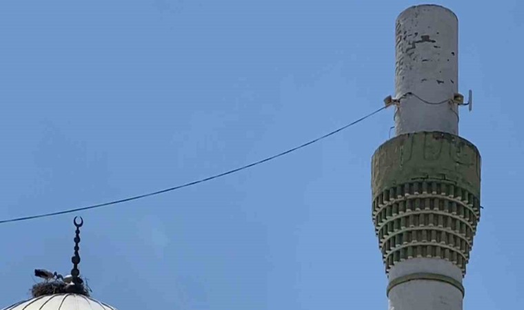 Manisa’nın Alaşehir ilçesinde önceki gün meydana gelen dolu yağışı ve fırtına üzüm bağlarında zarara neden olurken, minaresinin külahı yıkılan caminin kubbesinde yuvası bulunan leylekler, yaşanan afeti kıl payı atlattı.